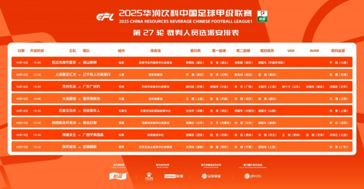 2025华润饮料中甲联赛第27轮裁判名单已正式公布,本轮比赛将有两场焦点战役配备视频助理裁判(VAR),分别是苏州东吴对阵广东广州豹,以及南通支云对战广西平果。